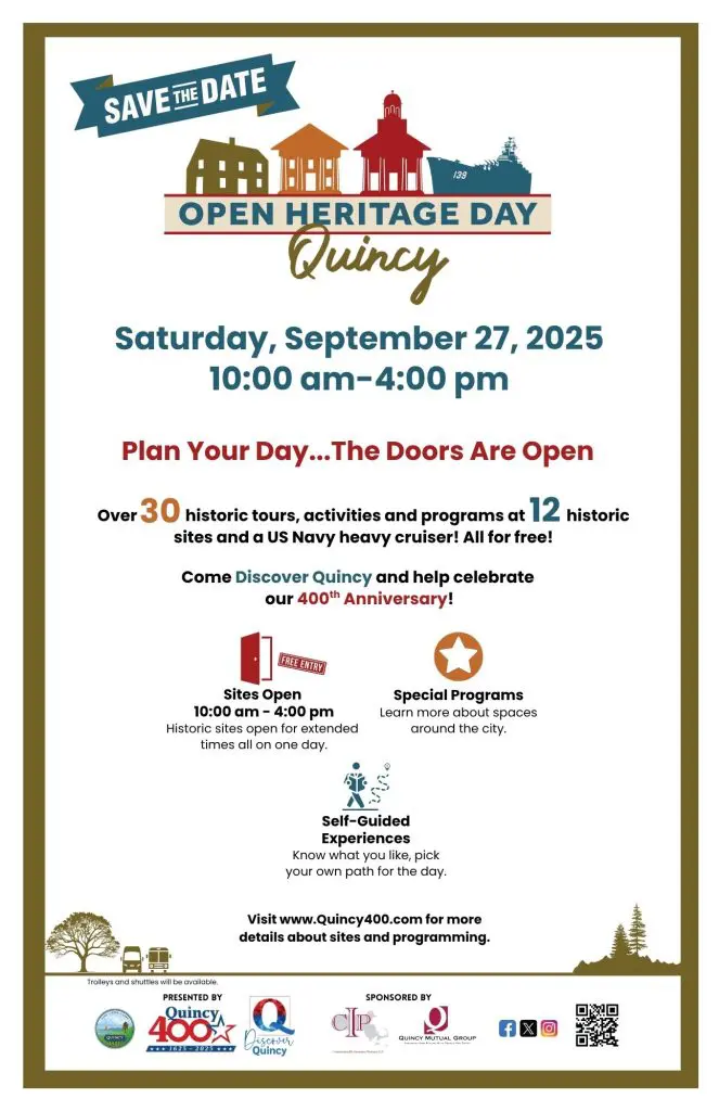 The town of Quincy is proud to host its very first Heritage Day! On Saturday, September 27, the Dorothy Quincy Homestead will be open to visitors from 10:00 a.m. to 4:00 p.m., with free admission. Complimentary buses will be running throughout the city, offering easy access to many of Quincy’s most historic landmarks—including the Adams sites, Quincy House, President Church, and US Salem. It’s a wonderful opportunity to explore our city’s rich history—all free to the public! Come to Quincy on Saturday the 27th, and make a special visit at Dorothy Quincy Homestead!